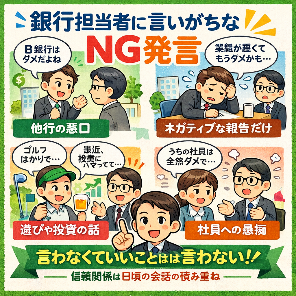• 銀行担当者との日常的な会話で、うっかり言ってしまいがちな「NG発言」の具体例