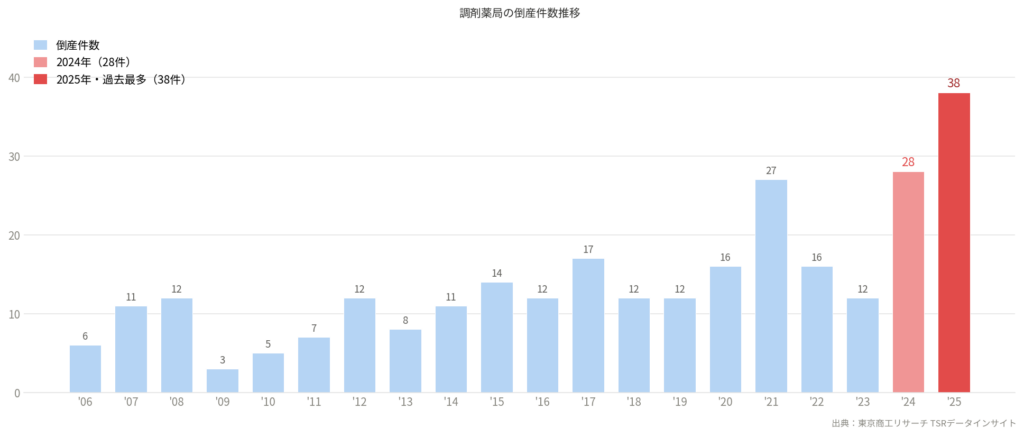 東京商工リサーチの調査によると、2025年に倒産した調剤薬局は38件。過去最多だった前年の28件をさらに上回り、2年連続で過去最多を更新しました。しかも倒産した薬局の約8割が、負債1億円未満の小規模薬局です。